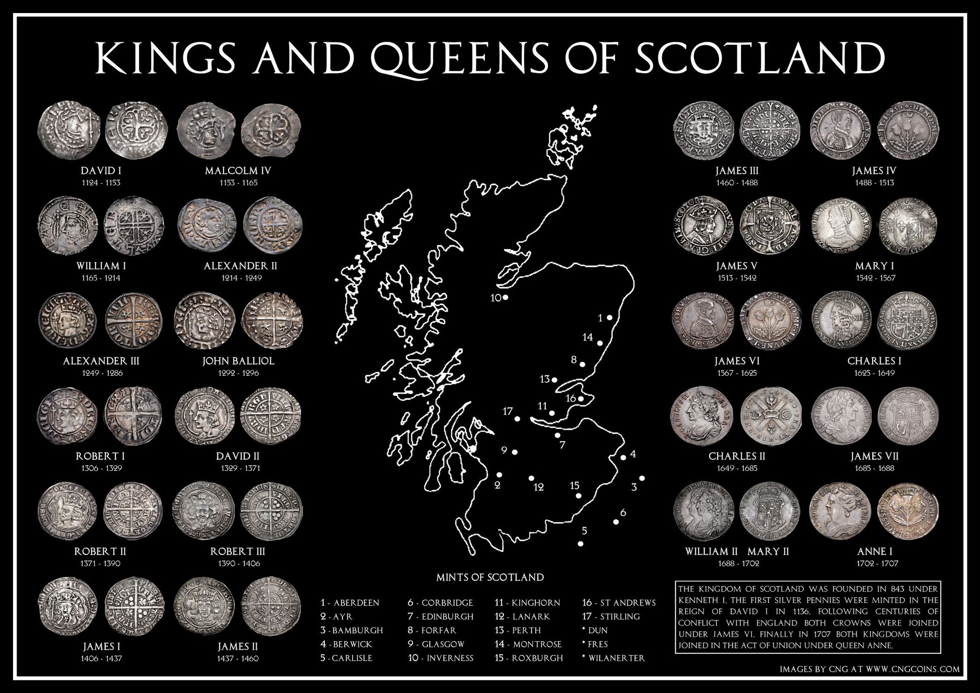 Featuring coins from every Scottish king and queen that minted coins from David I in 1124 to the act of union under Queen Anne in 1707. With a map of Scotland and the locations of mints.